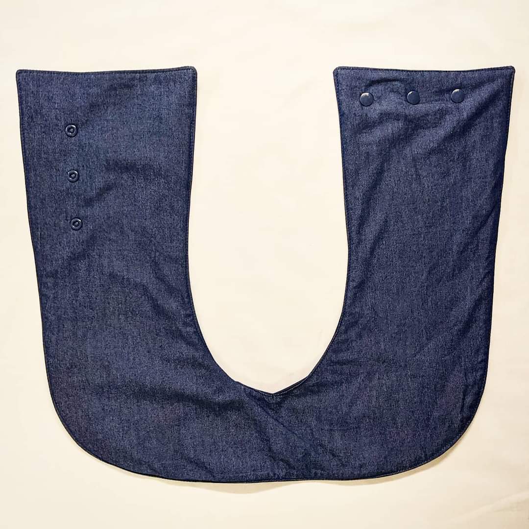 Fastened with three snaps down the front, holding it in place, and disguising the appearance to look more like a scarf than a bib, while covering the shoulder and front areas that are needed for functionality.