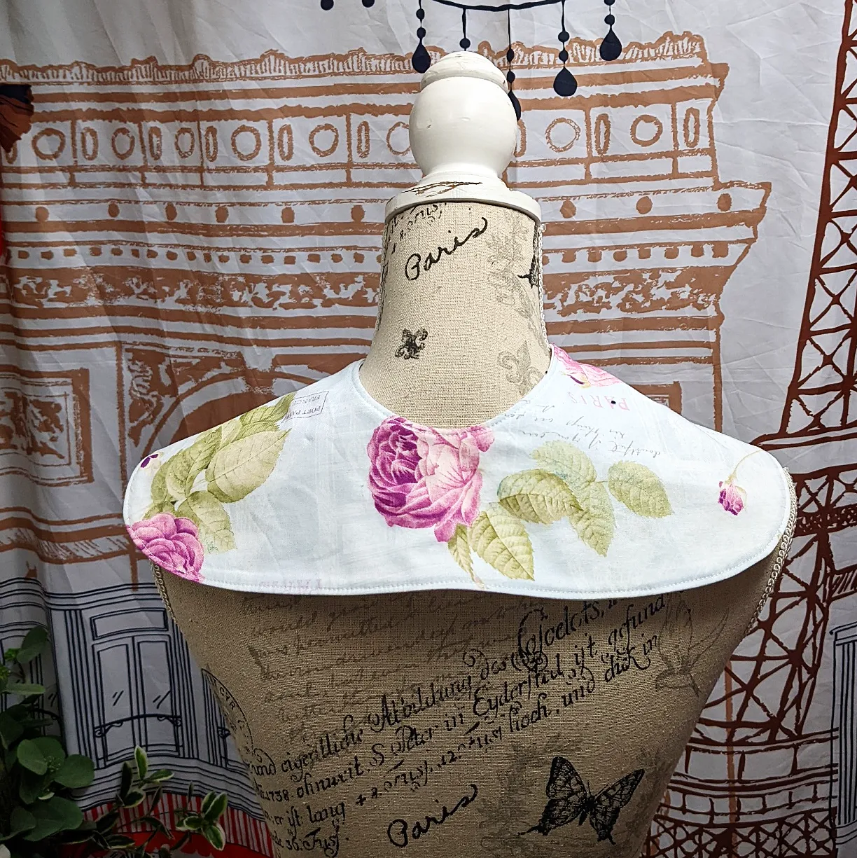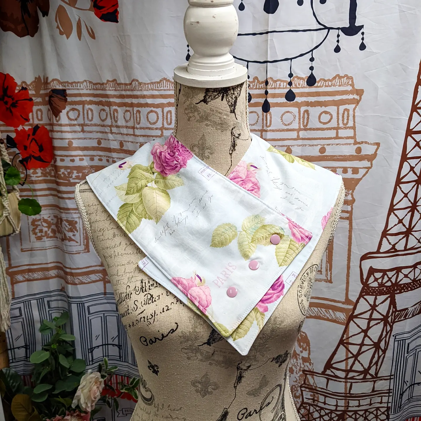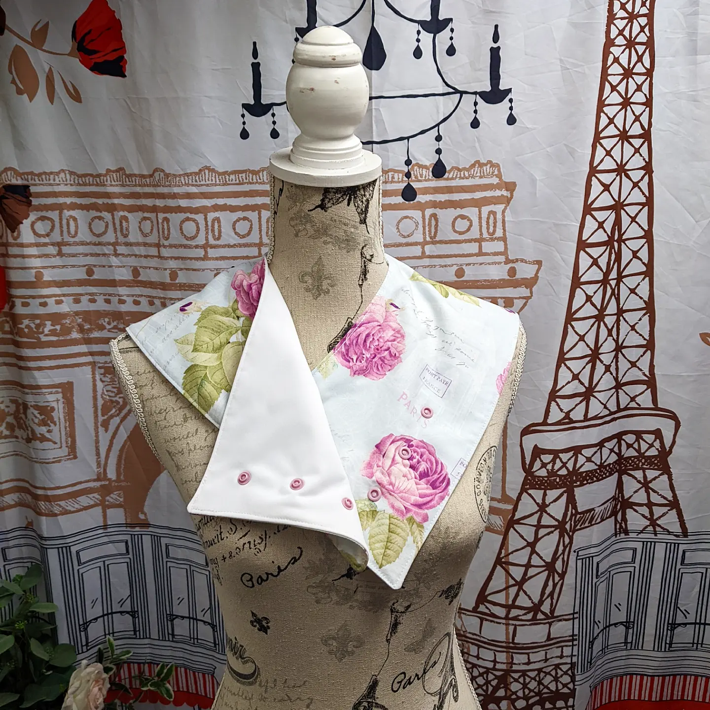 Fastened with three snaps down the front, holding it in place, and disguising the appearance to look more like a scarf than a bib, while covering the shoulder and front areas that are needed for functionality.