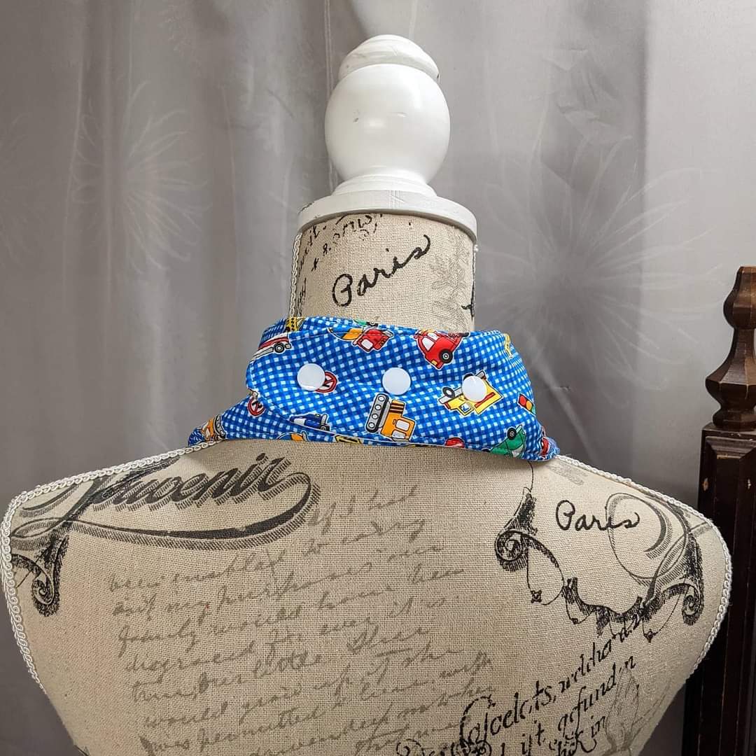 So I drafted and tested a new pattern enlarged from a baby bib up so it would fit a larger neck and head and figured out how to make the top layer drape more bandana like, but still fit around the edges, and be adjustable.