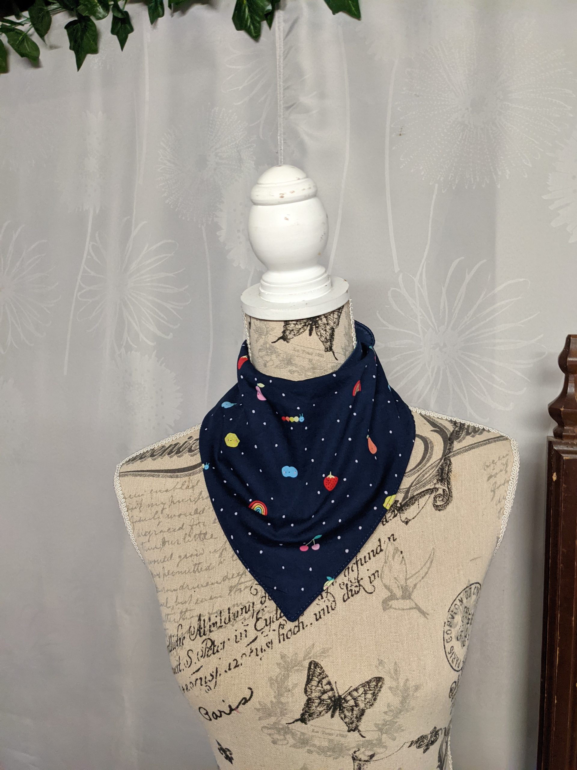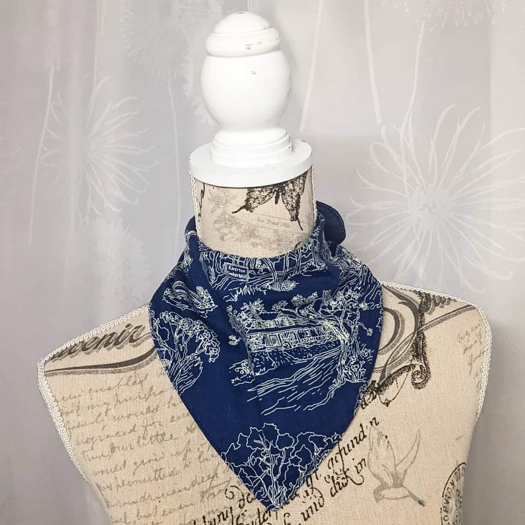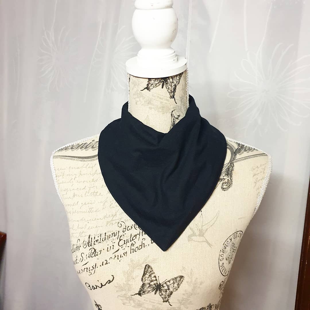 So I drafted and tested a new pattern enlarged from a baby bib up so it would fit a larger neck and head and figured out how to make the top layer drape more bandana like, but still fit around the edges, and be adjustable.