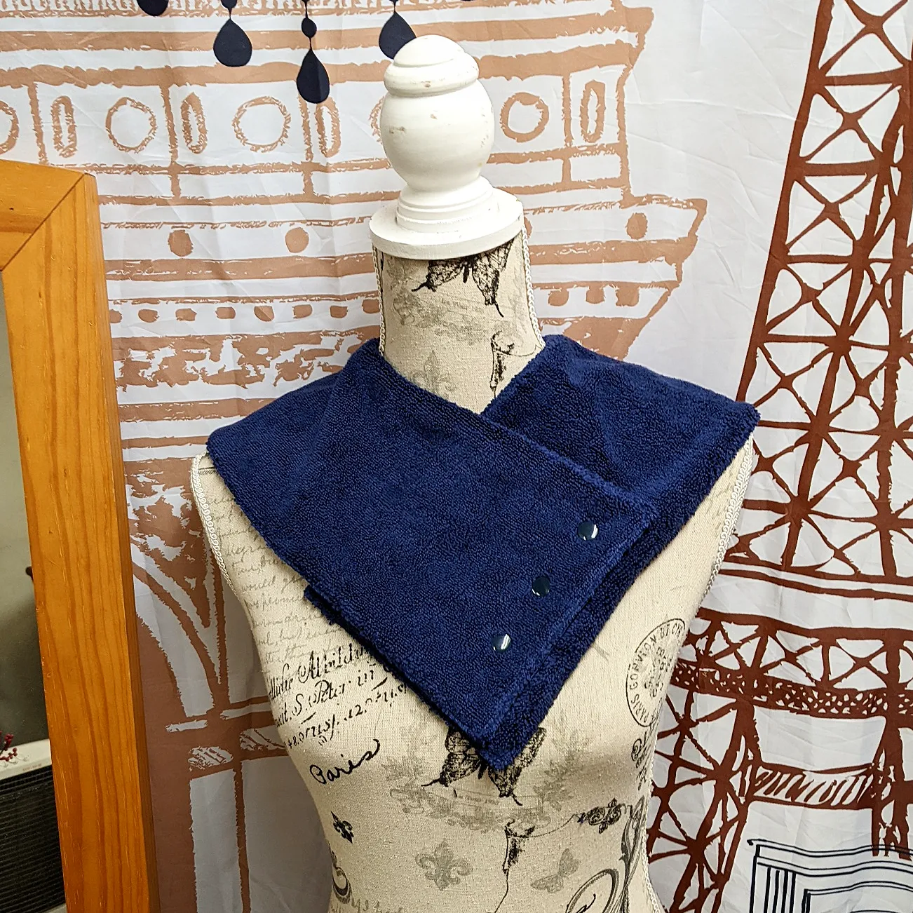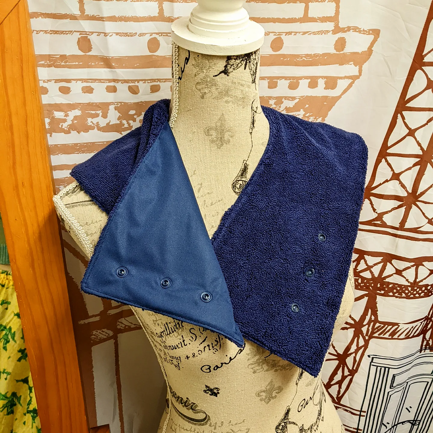 Fastened with three snaps down the front, holding it in place, and disguising the appearance to look more like a scarf than a bib, while covering the shoulder and front areas that are needed for functionality.