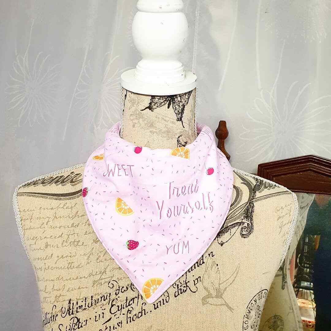 So I drafted and tested a new pattern enlarged from a baby bib up so it would fit a larger neck and head and figured out how to make the top layer drape more bandana like, but still fit around the edges, and be adjustable.