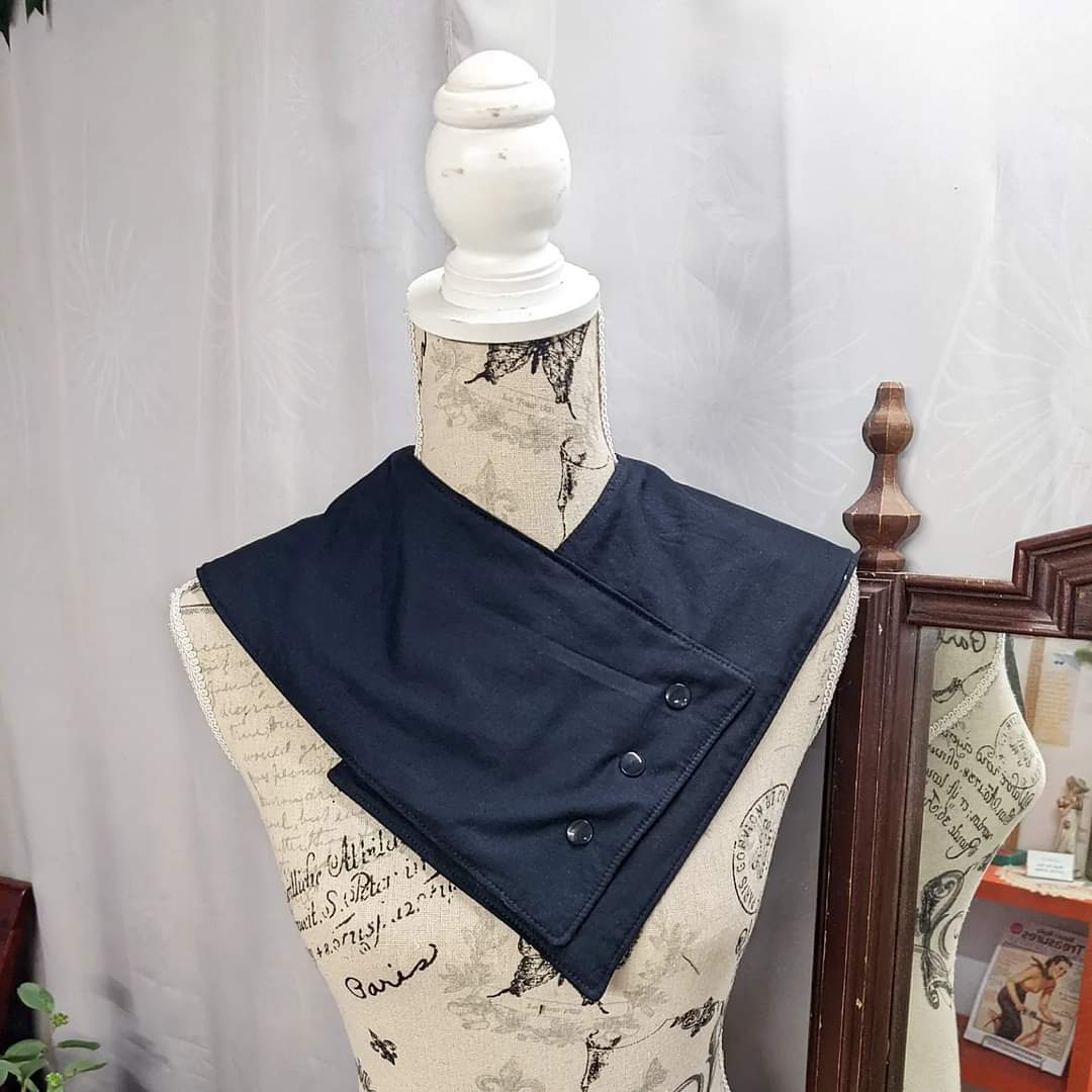 Fastened with three snaps down the front, holding it in place, and disguising the appearance to look more like a scarf than a bib, while covering the shoulder and front areas that are needed for functionality.