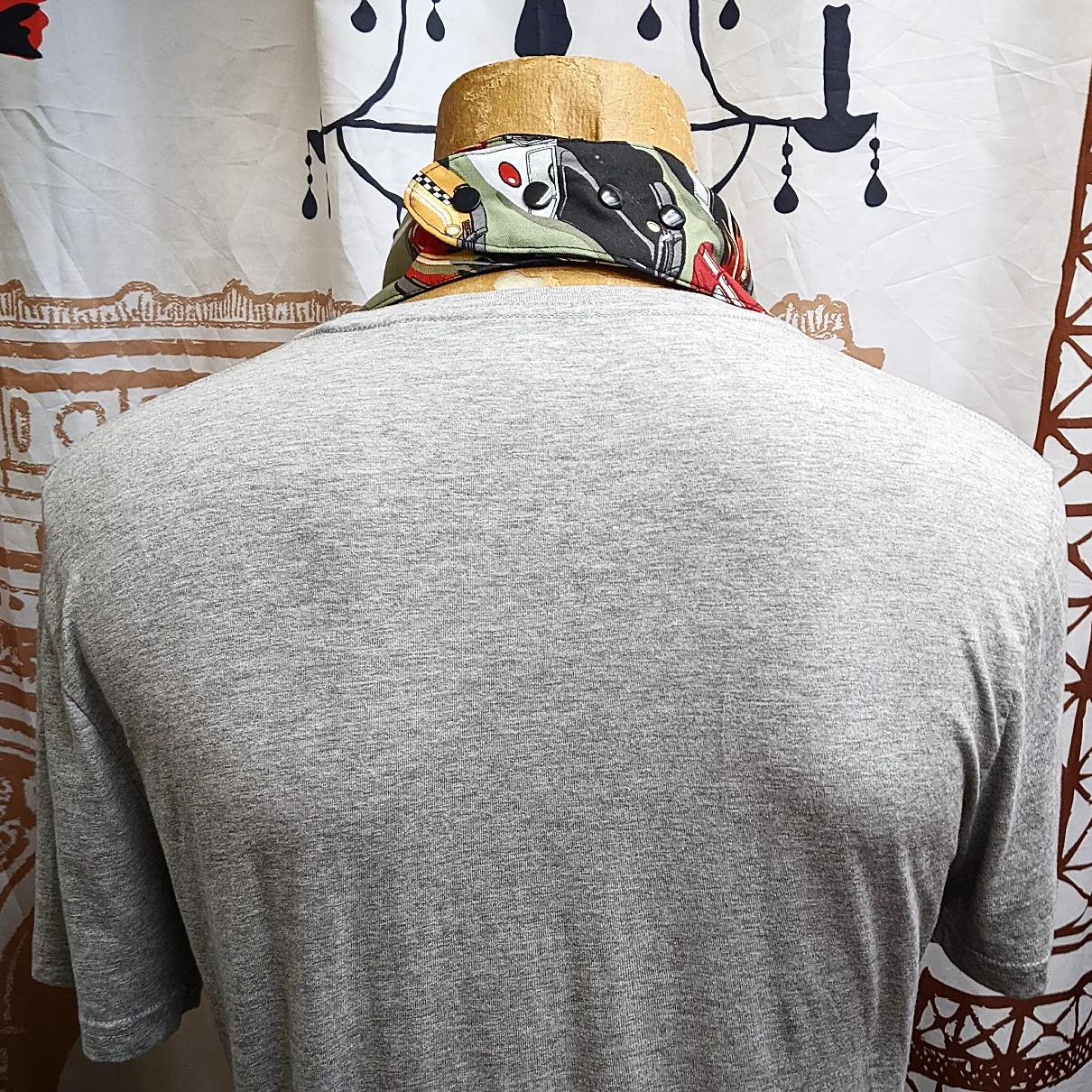 These bandana bibs are designed to cover mostly the under chin area, and are purposely narrower around the back of the neck to avoid any unnecessary warmth in our hot climate.