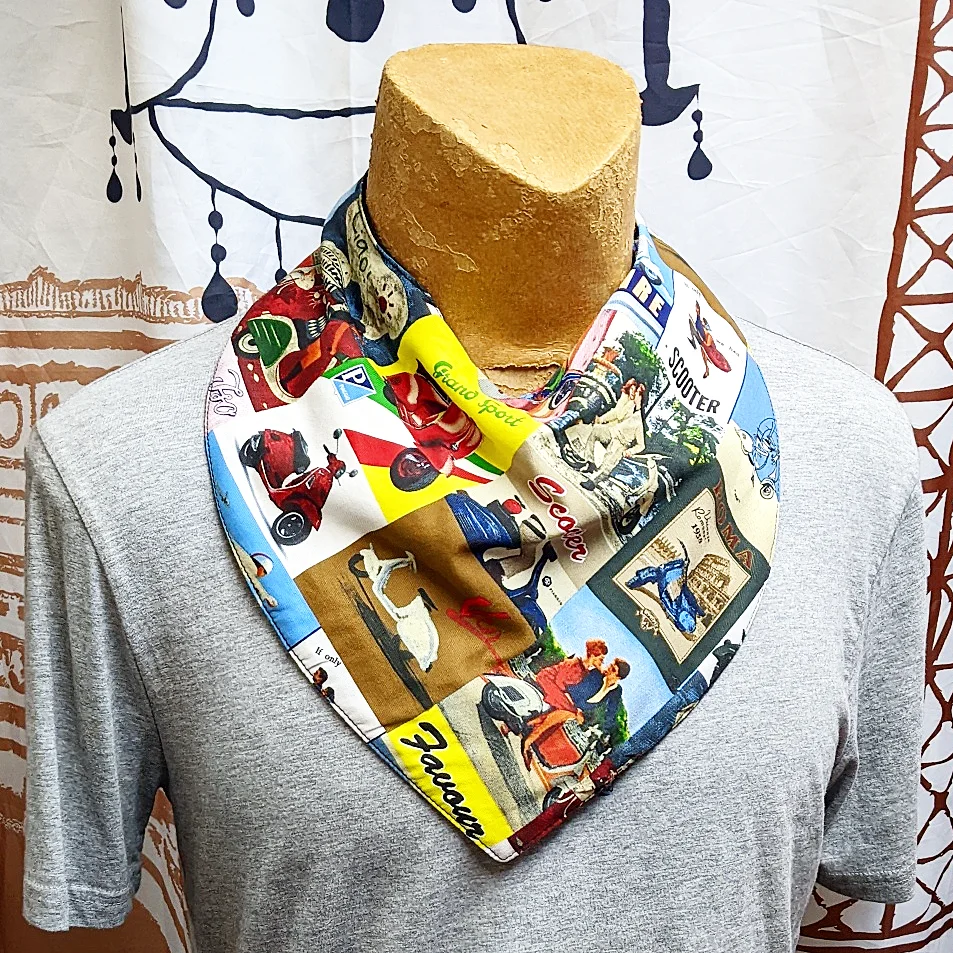 These bandana bibs are designed to cover mostly the under chin area, and are purposely narrower around the back of the neck to avoid any unnecessary warmth in our hot climate.